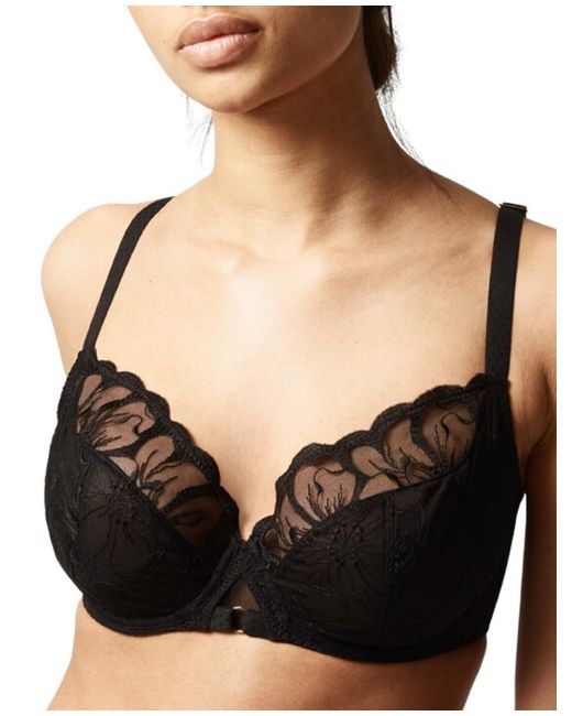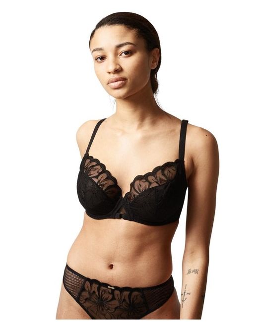 Feel luxurious and secure at the same time in this gorgeously feminine underwire bra from Chantelle's Fleurs range! This bra is impeccably designed to offer optimum comfort support with the chimney back with lycra lining, elastic finishes at the neckline, underarms, and back, the use of rigid tulle on the cups, centre front and sides, and the reassuring cup coverage. These features make this bra perfect for everyday use, but it doesn't compromise on style though! The delicate floral embroidery on the cups and the subtly revealing honeycomb fishnet back exude sophistication and opulence, allowing you to feel absolutely beautiful. The straps with polka dots, decorated with rings on the back, and the classic Chantelle branded plaque on the side finish off this piece with a fabulous flourish!.
