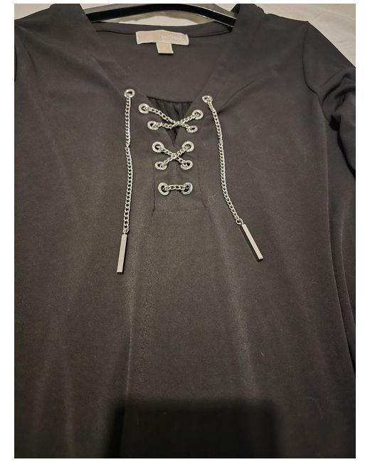 Lovely black Michael Kors tunic with tie belt, button up long sleeves and feature silver branded chain neckline. Never worn and in excellent condition. Listed as a size S but fabric has stretch so would fit size 10-14. Pit to pit 20".