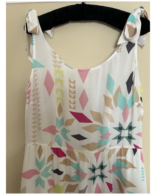 The White Stuff white abstract patterned dress in size 14 is a stylish and versatile piece perfect for various occasions such as travel, parties, or casual wear. The back of the dress buttons up and there are two concealed side pockets.