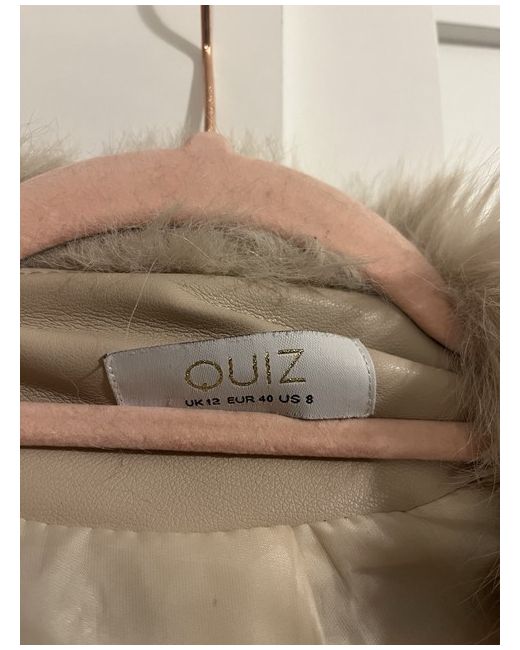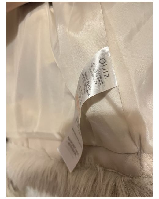 This is a women's fluffy coat from Quiz in size 12. The outer shell material is polyester, and the colour is beige. The style of the coat is fluffy, making it a cosy and stylish addition to a woman's wardrobe. -bought for £70