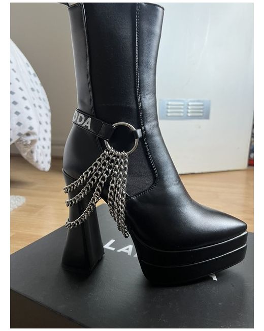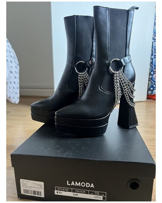 Elevate your style with these chic Lamoda chain heeled boots in size 4. Crafted from premium faux leather, these boots feature a sleek black colour that can easily complement any outfit. The bootie design and comfortable heel make them perfect for all-day wear, while the chain detail adds an edgy touch to your look. These boots are perfect for women who love to make a statement with their footwear. They are made from high-quality materials and are designed to last. Whether you're dressing up for a night out or running errands during the day, these Lamoda boots are a must-have in your wardrobe.