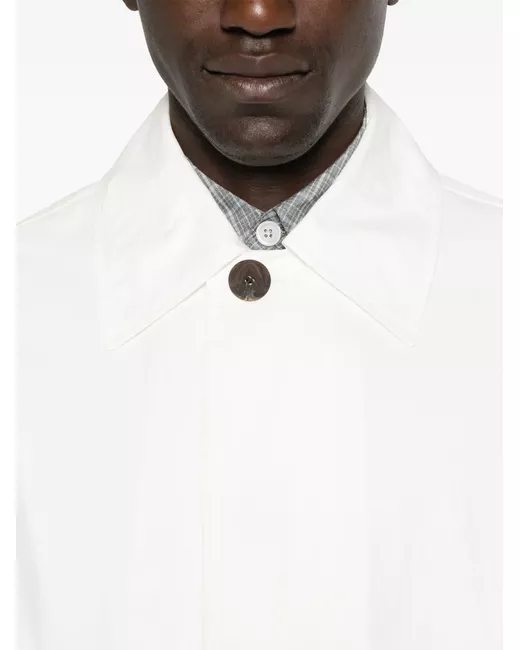 white front button placket two side welt pockets classic collar straight hem