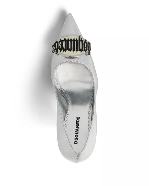 color argento pelle finitura metallizzata placca con logo design a punta design slip-on soletta in pelle con logo tacco a stiletto 100mm suola in pelle
