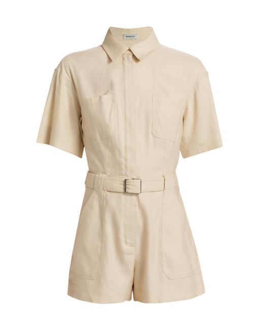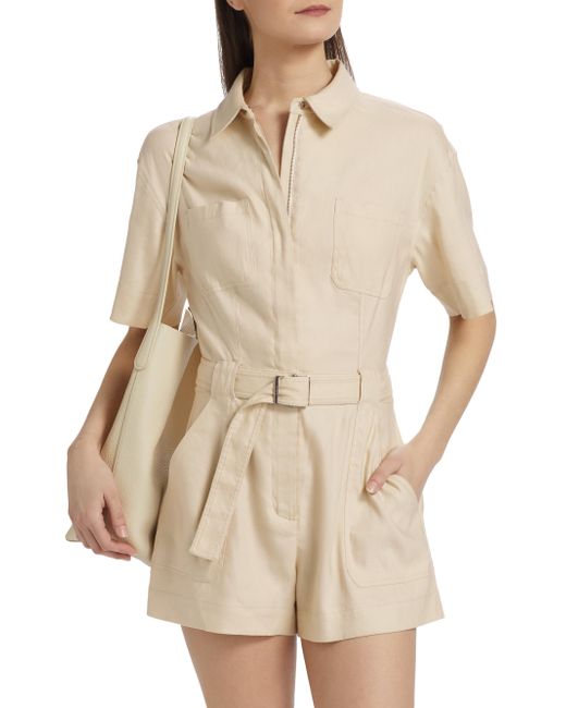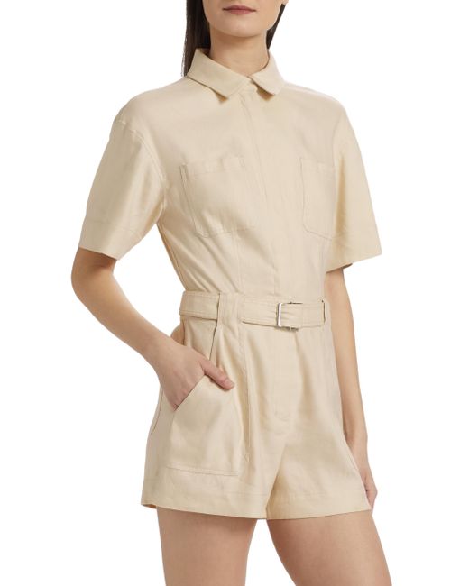 The Aspen linen-blend romper from SIMKHAI is styled with a modernized utility aesthetic featuring a concealed button-front and a tonal belt. Point collar Short sleeves Belted waist Button-front closure 51% linen/46% rayon/3% elastane Dry clean Imported SIZE & FIT About 30" from shoulder to hem Rise: about 13" Inseam: about 3.25" Leg opening: about 26.5" Model measurements: 5'10" tall Model is wearing a US size Small. Contemporary Sportswear - Workshop > Simkhai > Saks Fifth Avenue > Barneys. SIMKHAI. Color: Sand. Size: 10.