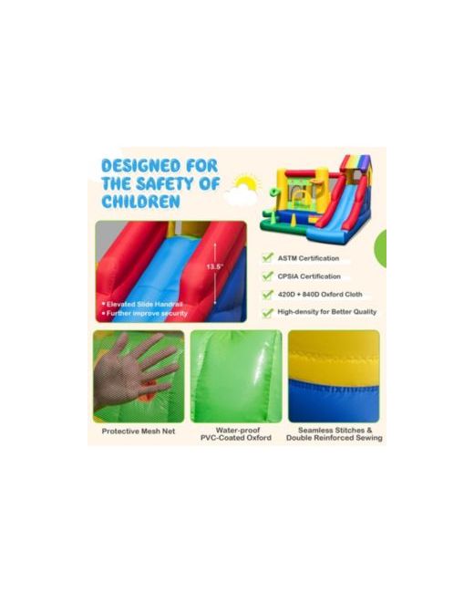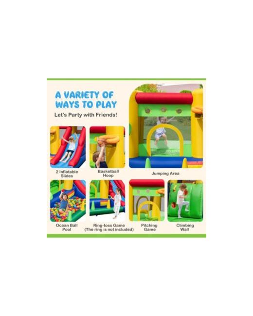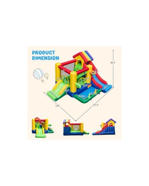 This luxury rainbow-themed bouncy castle offers endless fun with its bouncy house, slides, ocean ball pool, basketball hoop, and climbing wall. Made of durable Oxford cloth with safety features, it s perfect for indoor and outdoor play. Quick to inflate with a 735W blower, it provides joyful memories for kids year-round.