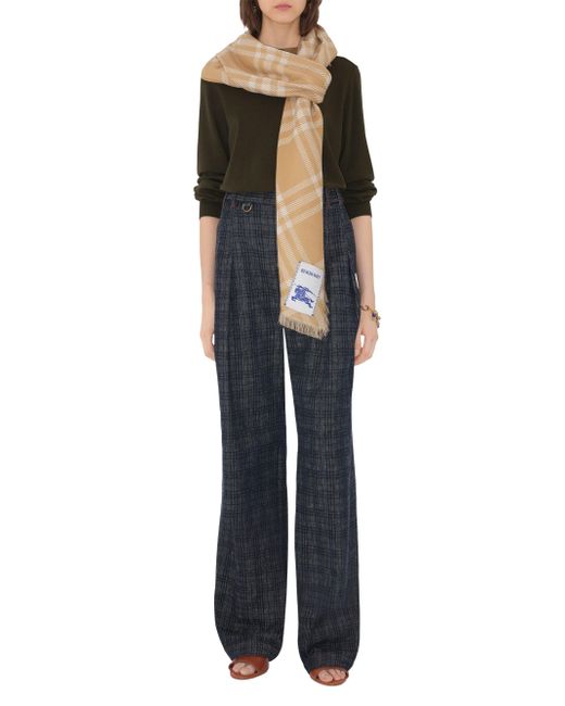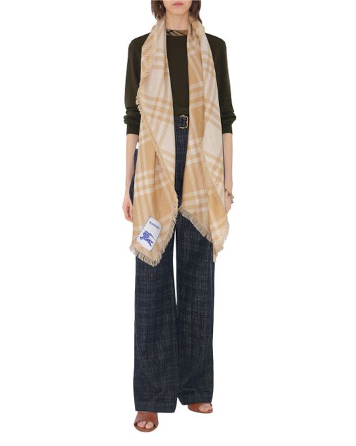 Crafted of luxe wool of Italy, Burberry's scarf features wide check motifs, a signature equestrian knit logo detail, and a fringed trim. Wool Dry clean Made in Italy SIZE About 25.6"W x 78.7"L ABOUT THE BRAND Founded in 1856 by 21-year-old Thomas Burberry, the brand set out with a mission to stylishly protect against British weather-and Burberry's iconic trench coat was born. In the 1920s, its renowned check pattern was introduced as the coat's lining. Today, under Creative Director Daniel Lee, the heritage brand continues to evolve and create timelessly classic men's, women's and kids' pieces, along with beauty. Soft Accessories - Burberry Soft Accessorie > Burberry > Saks Fifth Avenue > Barneys. Burberry. Color: Sand Ecru.