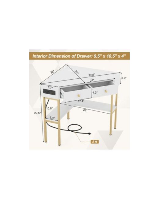 This 90° triangular corner desk is a stylish and functional solution for compact spaces. With a built-in charging station, spacious desktop, and ample storage, it s ideal for home offices. Built with a sturdy metal frame and anti-toppling device, this versatile desk blends seamlessly with modern interiors.