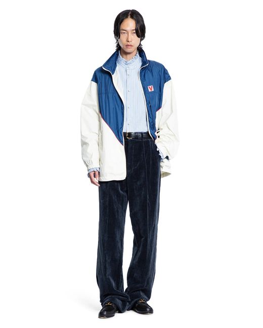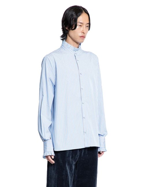 sky bluestriped cotton poplin stand collar with ruffled trimcovered button closuredropped shoulderslong sleevesbuttoned cuffs with ruffled trimback gathered shoulder yokestraight hemregular fit