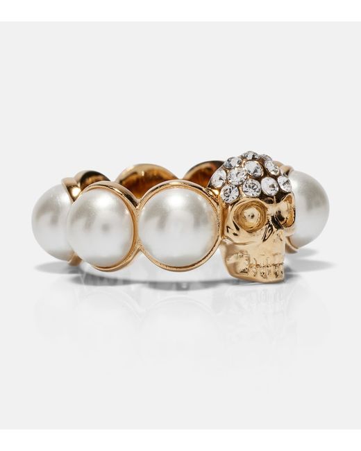Pearl-embellished skull ring