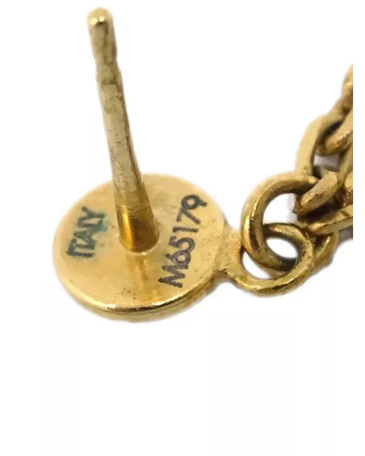 circa 2013 placcato oro design pendente decorazione con strass logo inciso chiusura a pressione modello per lobi forati Questi orecchini sono venduti in coppia. Condizione: BUONA. Questo articolo Pre-owned è in buone condizioni e presenta segni d'uso minimi. Ciò può includere sbiadimento del materiale o placcatura e graffi.