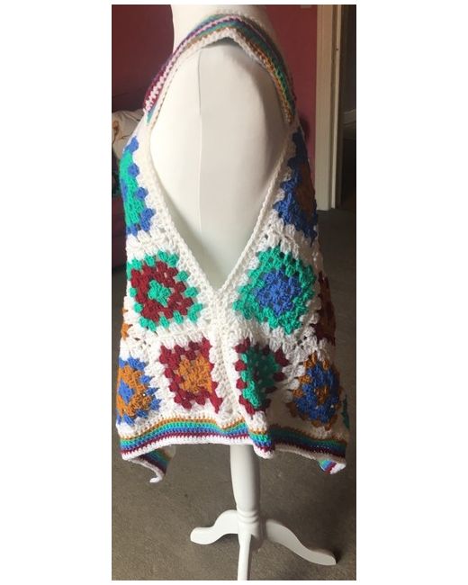 Crochet summer top handmade by me. Made with classic granny squares in summery colours with white as the base colour. Sleeveless with quite thick straps. This is a cute summer top perfect for festivals or with a pair of jeans or shorts. Size 12-14. Machine washable.