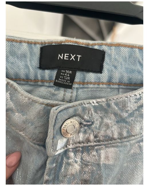 Brand: NEXT Size: 14 Fit: Classic Size Type: Regular Department: Women Type: Jeans Style: Straight Material: Cotton Features: Coated Fabric Type: Denim Colour: Silver These Next High-Rise Jeans in size 14 are a classic fit with a straight style. Made from cotton denim, they feature a coated finish in a stylish silver colour. Perfect for adding a touch of glamour to your wardrobe.