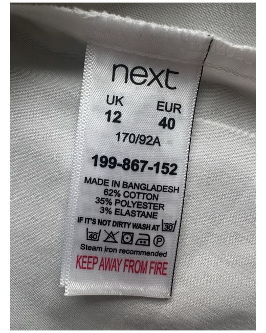 Next Smart fitted White blouse with hidden buttons and 2 buttons on sleeve. Nice stretchy material for easy movement. Size uk 12 62% Cotton 35% polyester 3% elastane BNWT