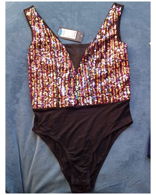 Striking coloured sequined bodysuit. press stud gusset fastening. black and multi coloured sequins on front. Sequins reflect different colours see pics.