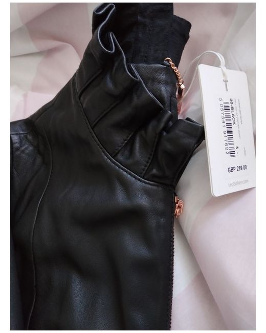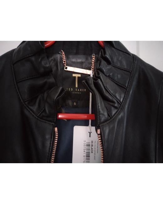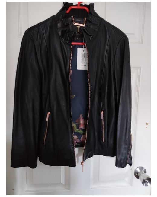 Ted Baker soft leather jacket size 5 (16) Rose gold zips Ruffle collar 2 side pockets 3/4 length sleeves with zips Floral navy lining Under arm to under arm 50cm approx Length 55cm approx Never worm had for a few years