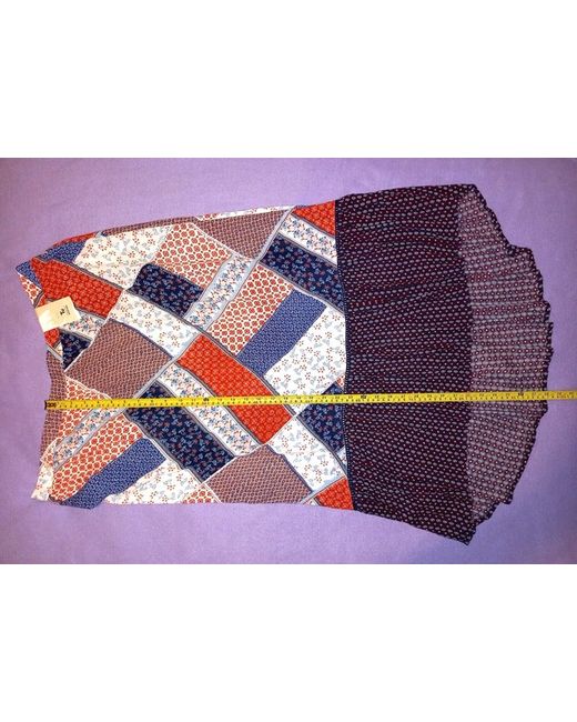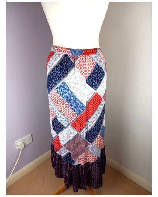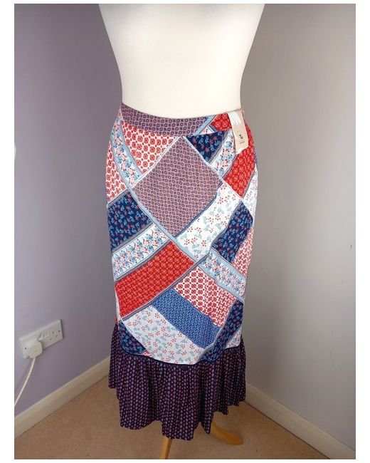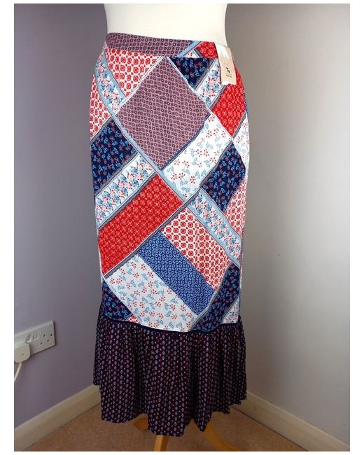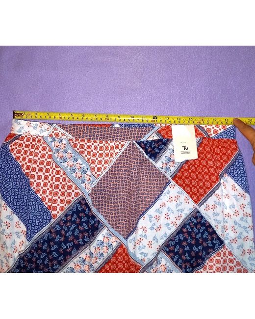 Midi length depending on height, with back cut longer than front - approx. 32ā from waist to front hem and 38ā from waist to back hem, as shown in photos. Tu Woman āScandi Bluesā skirt. Smaller size clothing may be shown on a smaller size gold hanging half-mannequin.