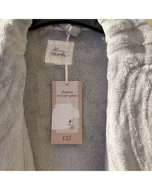 This is a TU brand grey patterned bathrobe dressing gown for women in a size large. It features a kimono style design with pockets for added convenience. Made from polyester material, this brand new with tags (BNWT) robe is perfect for lounging or getting ready in style and comfort.