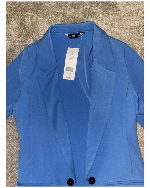 This is a new blazer with tags from F&F in size XS for women. The blazer is made of cotton in a blue colour. It is a basic jacket style, suitable for regular-sized individuals.