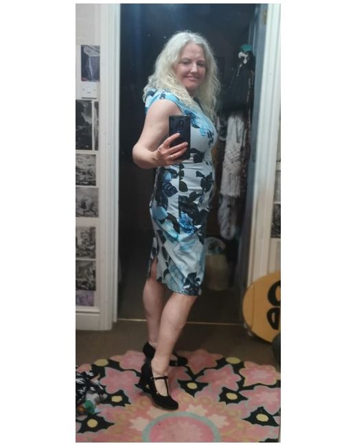 Beautiful and unusual ice blue floral cocktail dress, fully lined, size 12. Feels comfortable and quality to wear (tried on for pics). Great for petite or would be slightly shorter length on a taller lady. I am a size 14 so as you can see this is a little snug on me! But just gives you an idea of the final look if you are fortunate enough to be a size 12..!
