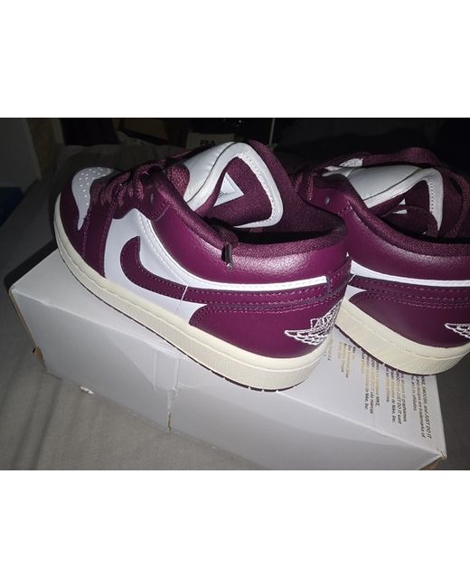 brand new Half box The Jordan 1 Low 2.5 is a stylish and comfortable women's trainer in a UK shoe size 2.5, equivalent to a EU shoe size 35.5. This low-top sneaker features a lace-up closure, leather upper, and rubber outsole, making it perfect for casual occasions in the summer season. The purple colour and signature Jordan logo add a touch of sporty elegance to the shoe, which is part of the iconic Air Jordan product line. Made in Vietnam, this standard-width sneaker is a must-have addition to any fashion-forward woman's wardrobe.