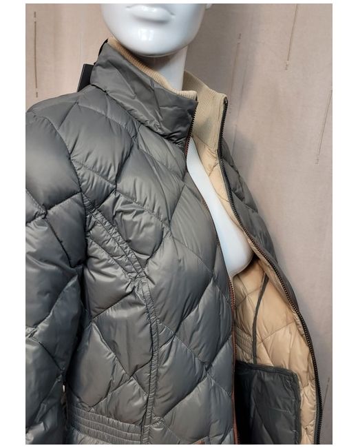 An outstanding quilted jacket by PER UNA. Light in weight, but warm with a full down & feather filled quilted lining. Sage green colour. Tan leather look trims at the edges. Outer: 100% polyamide, Filler: 90% down, 10% feather.