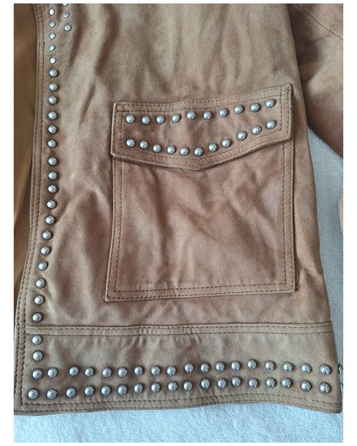 Stylish All Saints sueded 'Evans' jacket. Butter soft suede in a light tan brown shade. Studded design. Size Large. Would fit a size 10 to 12. Beautiful, lovely quality jacket. Length shoulder to hem - 21".