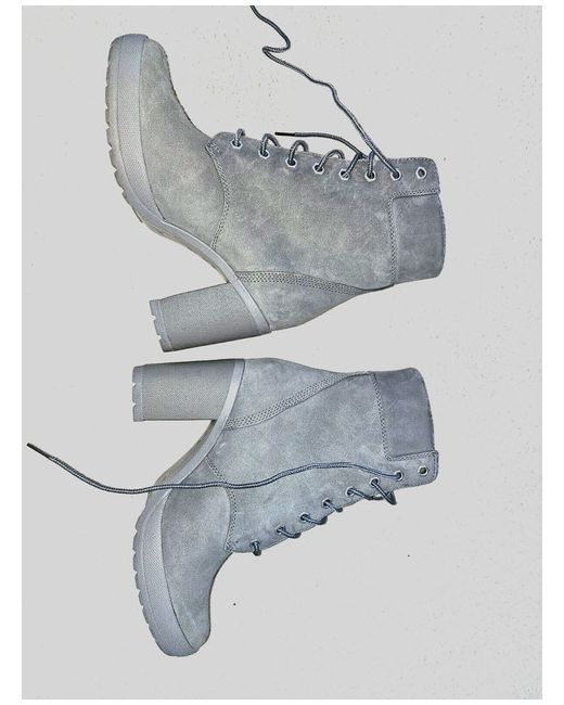 These are grey Timberland women's boots in size 5. They are a high heel style, with a US shoe size of 7.