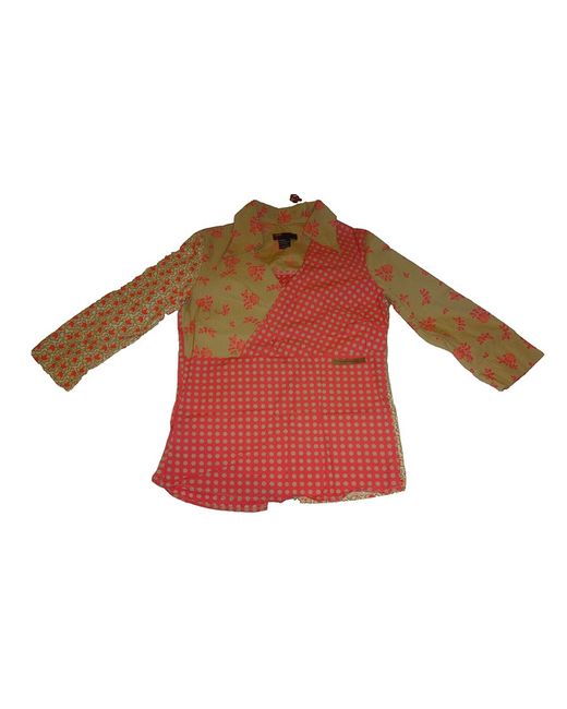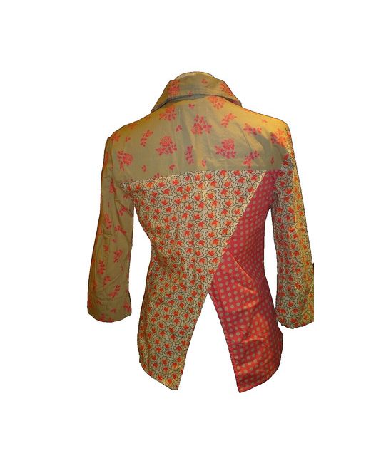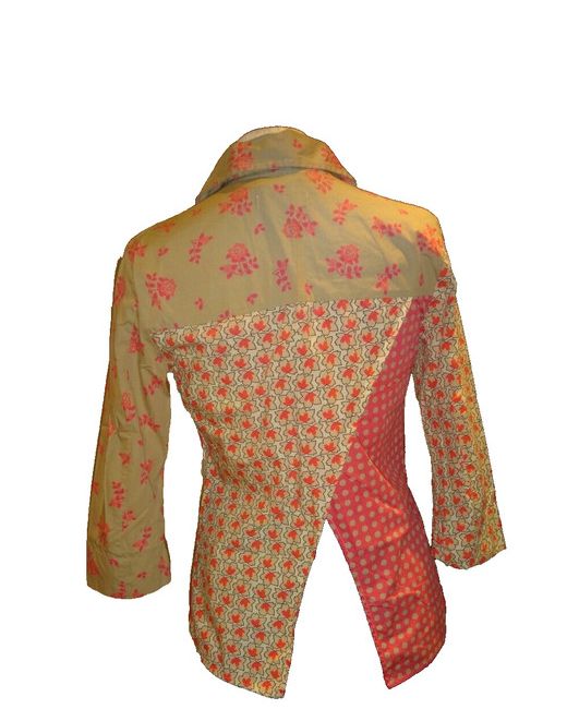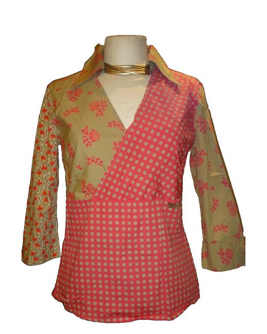 It features a multi-coloured patchwork print on 100% cotton fabric with a collared neckline and 3/4 sleeves. The shirt has an open back design, in wrap style, making it lightweight and suitable for all seasons.