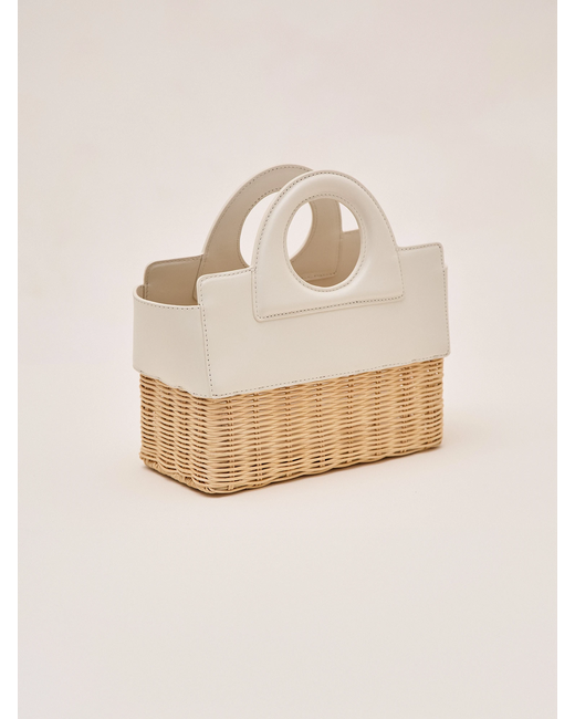 The Penelope hand bag is a blend of leather and handwoven rattan, featuring a structured silhouette. Designed with a removable interior leather pouch and a detachable crossbody strap for versatile styling.