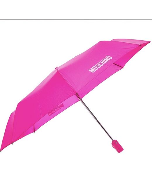 Moschino PinkPrint Logo Umbrella Compact Black with Case - New. Canopy width: 92cm. Velcro strap to secure. Compact to fit in bag or Coat pocket. Matching carry case. With carry strap. Compact size.