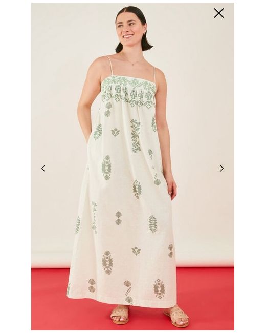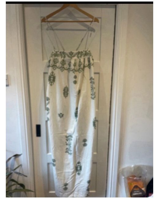 This is a new with tags Accessorize maxi dress in size large. The dress features a sleeveless design with a square neckline, ideal for travel or casual occasions during the summer season. Made from 100% cotton in an ivory colour, this long dress falls elegantly to the floor, perfect for a stylish and comfortable look. The dress is designed in a maxi style by the brand Accessorize. This is a large - so I would suggest more a 14-16 as Accessorize are generously made. Cost £55