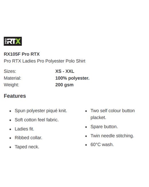 RX105FPRO RTX Ladies Pro Polyester Polo Shirt -. RX105FPRO RTX Ladies Pro Polyester Polo Shirt Sizing Guide. Spun polyester piqué knit. Solid Grey. Spare button. Ladies fit. Ladies size: 8 10 12 14 16 18.