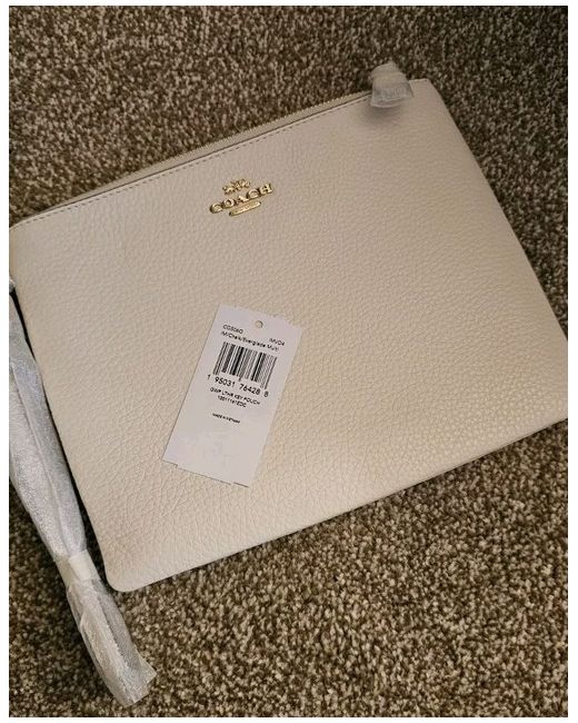Coach leather ivory color wristlet. it can carry keys , cards, phone and paper notes . Pretty reasonable size with leather straps to carry in wrist.