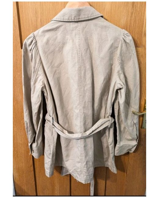 This GAP Belted Safari Jacket in size S is a stylish addition to any wardrobe. Made from a linen blend fabric in a cream colour, this trench coat style jacket features a denim fabric type, giving it a unique and versatile look. The belted design adds a flattering silhouette to this never worn jacket, making it a chic and practical choice for any occasion.