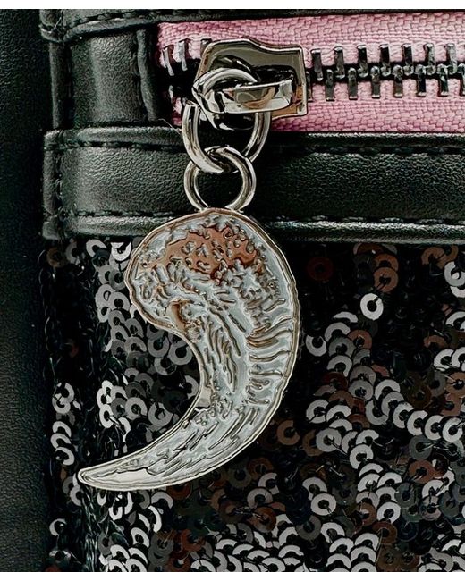Cloisonne Loungefly x Jurassic Park Label. Circular and Tropical Floral Print. Universal Pictures Exclusive. Pink Trims. Exterior Front Pocket. Black Sequinned Front Pocket. Double Zip Fastenings.