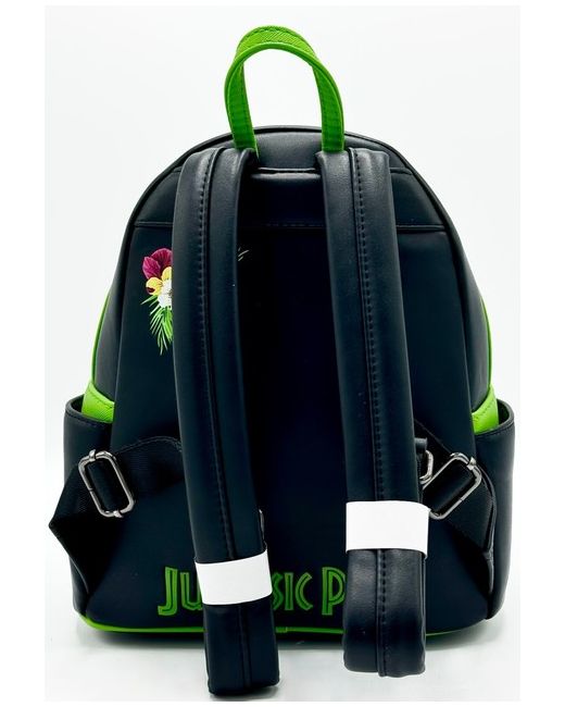 Cloisonne Loungefly x Jurassic Park Label. Circular and Tropical Floral Print. Creasing is common on the material of this bag. Universal Pictures Exclusive. Black Sequinned Front Pocket. Exterior Front Pocket.
