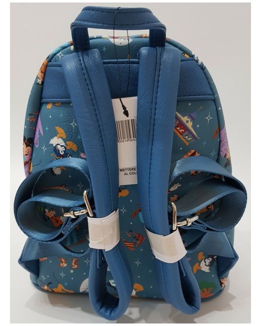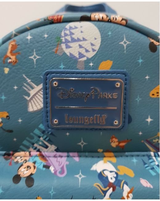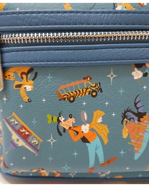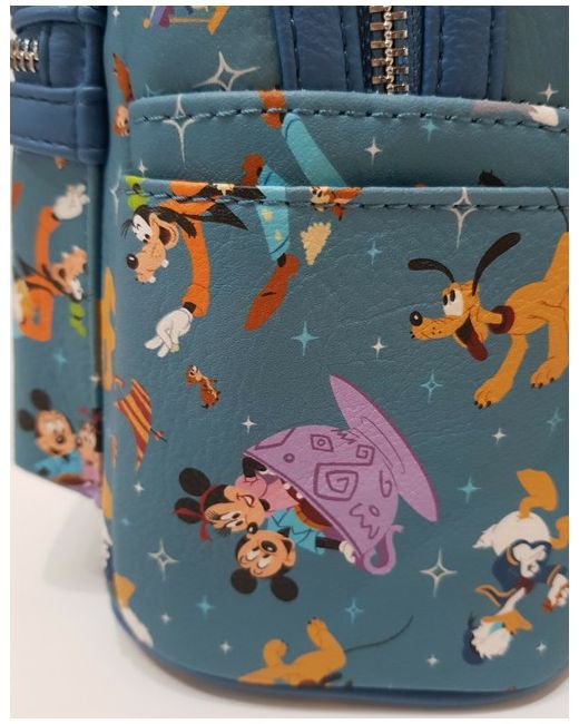 Cloisonné Disney Parks X Loungefly label on front. Mickey and Minnie snuggle in a teacup while Donald, Pluto, Goofy, and Chip 'n Dale see the sights at. Allover print of characters and Walt Disney World landmarks.