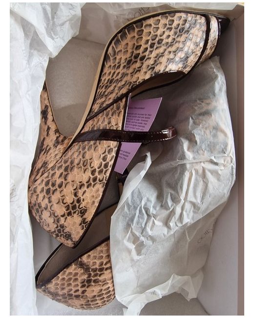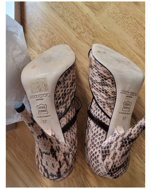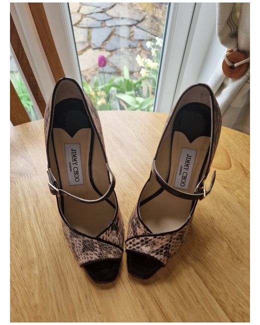 Stunning Jimmy Choo 4.5-inch heels in size 4. A cross between a court and a sandal with an open toe and closed heel with a strap on the front. Elaphe/Snake skin and patent upper, labelled light pink on the box, but I'd say more a taupe with a pink blush and brown accent. Bought from Cruise (Glasgow) £435 at the time, between 2010 and 2012, you won't find these in this condition anywhere. Worn once indoors only, still in original box with dust bag.
