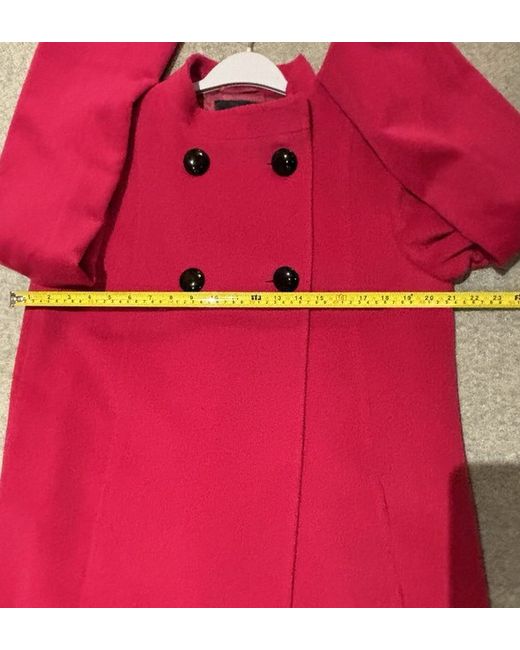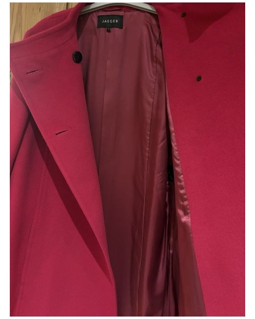 Jaeger pink wool coat with side pockets, full lining and back inverted pleat. A-line sixties style double breasted coat with large black glossy buttons.