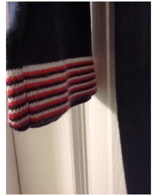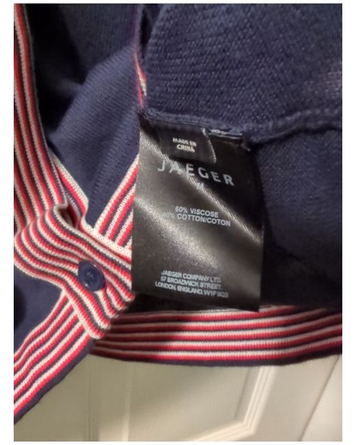 Navy multi trim Buttons Pockets Length 27,5 inches Pit to pit across back without stretch approx 19 inches Jaeger size M.