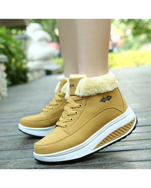 Shoe Type: Boots2. Season: Winter4. Occasion: Casual, Sports5. Toe: Round Toe6. Closure Type: Lace-Up7. Heel Height: 5cm8. Platform Height: 3cm9. Color: YellowMaterial:Upper Material: PUOutsole Material: Rubber.