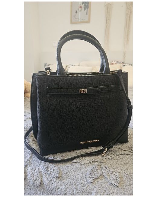 This Victoria Hyde handbag is a stylish medium-sized shoulder bag made from black faux leather. It is designed for women and features a matching faux leather handle/strap.