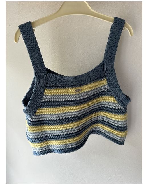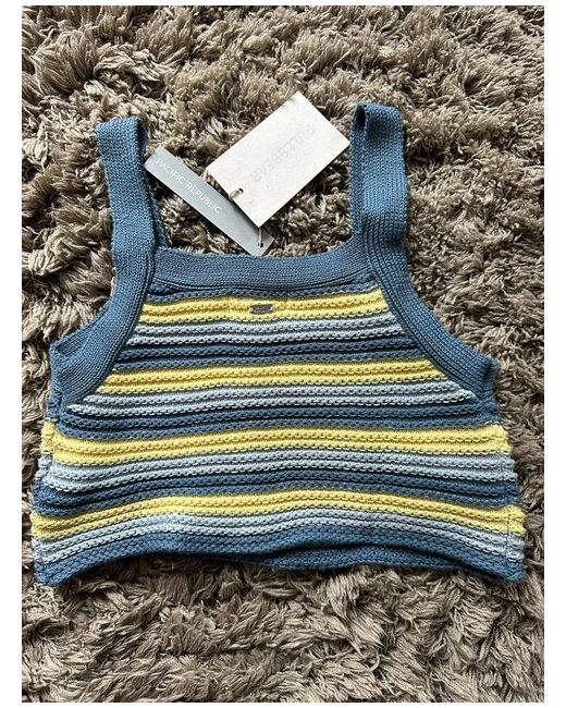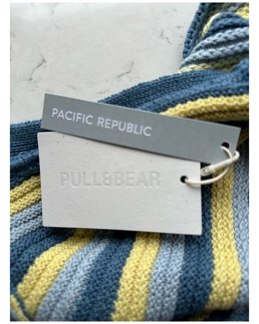 Upgrade your summer wardrobe with this stylish Pull&Bear Pacific Republic cropped cami top. The blue and yellow striped design is perfect for adding a pop of colour to your outfit, while the knitted cotton and acrylic fabric ensures comfort. The sleeveless style with a regular fit and XS size makes this top a versatile addition to any wardrobe, whether you're dressing up or down. Ideal for women of any age, this tank top features a Pull&Bear brand label and is perfect for wearing to any casual occasion. Whether you're hitting the beach, running errands or meeting friends for lunch, this top is sure to impress.