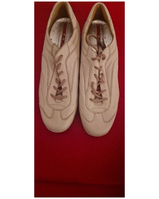 Elevate your casual wardrobe with these stylish Prada trainers. Crafted from high-quality leather, these sneakers feature a lace-up closure for a comfortable fit. The beige colour and subtle accents make them perfect for any occasion, whether you're running errands or meeting up with friends. These trainers are part of the Prada product line and are designed for women with a UK shoe size of 4 and US shoe size of 6. The insole is made from polyurethane, while the outsole is also crafted from leather for added durability. Add these designer trainers to your collection today and step out in style. Trainers have never been worn and in great condition. The trainers come with a grey prada drawstring bag, not a box. From pet/ smoke free home.