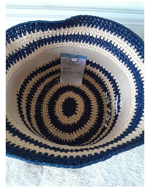 Add some Italian luxury to your wardrobe with this navy and natural striped Prada bucket hat. Made from high-quality raffia, this stylish hat is perfect for any fashion-conscious woman. The subtle Prada logo adds a touch of sophistication without being overpowering. Crafted in Italy, this bucket hat is the perfect accessory for any summer outfit. The versatile M size fits most head sizes comfortably. The classic striped pattern will match with a range of styles and colours, making it a valuable addition to your accessory collection.