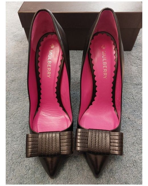 Brand new Mulberry black heels, size 38. Original, with box, bag and replacement heels. Never been worn. Received as a gift and fell pregnant soon after, now too small for me! Stored carefully, non smoking no pet household. Soft black leather, gold bow buckle and vibrant pink inside. Fab christmas present