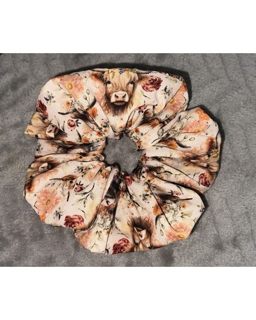 Introducing the Highland Cow Medium Scrunchie, Handmade in a clean environment, rough sizing in pictures. Made of soft and stretchy fabric with bold colour accents, this round-shaped scrunchie features a charming cow theme that adds a touch of fun to any outfit. this multicoloured scrunchie is a must-have for women who love to add a touch of style and fun to their hair.