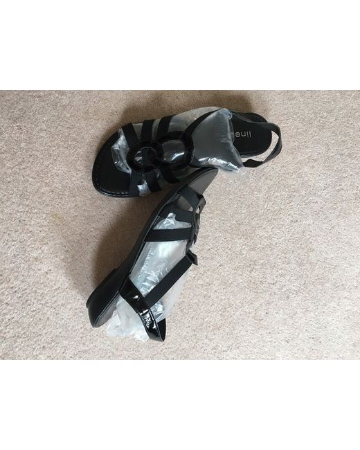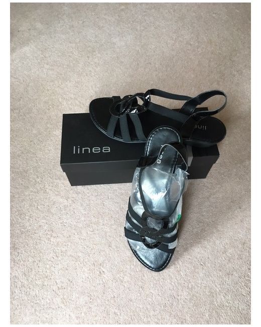 Linea Strappy Sandal. Size 40 Black elasticated with patent decorative design detail and patent back strap. BNIB.These are comfortable sandals with ‘give’, pretty enough to wear for special occasions