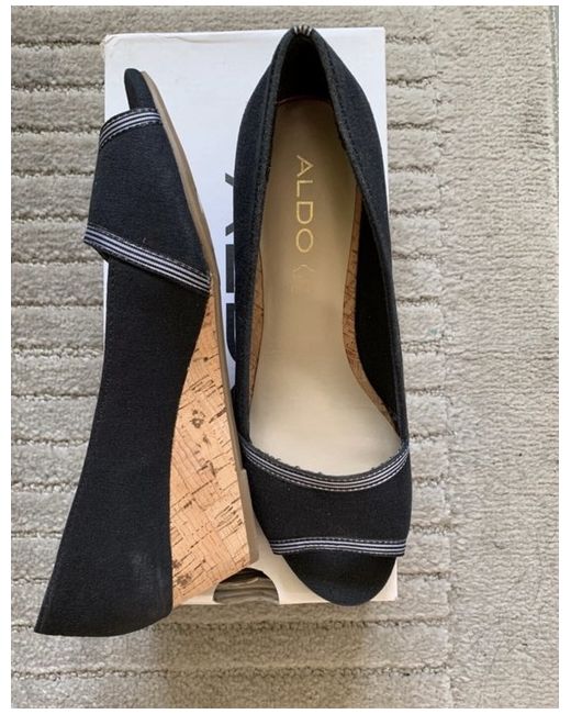 Aldo wedge shoes in navy are a stylish. The upper material is a cotton blend, and the heel style is a wedge, providing comfort and elegance in a size 5.