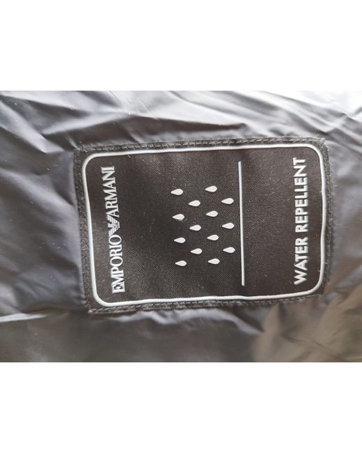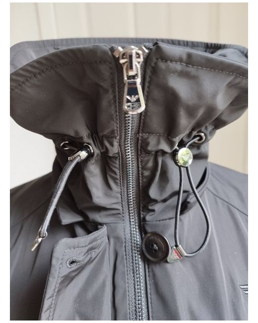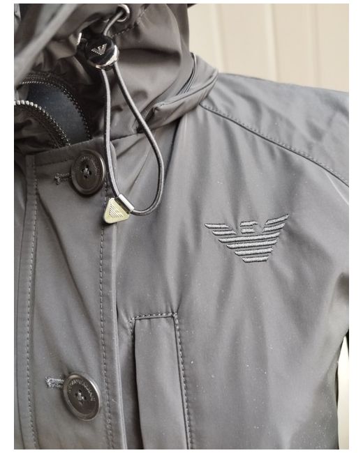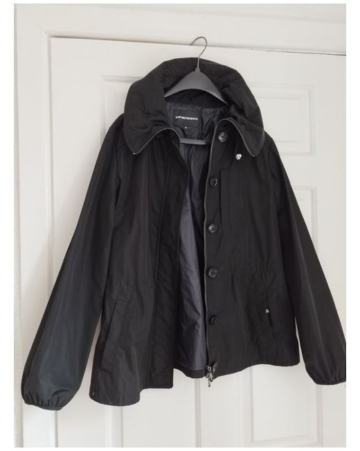Authentic EMPORIO ARMANI (3G2B65 2NREZ) Designer black polyester women's Jacket in new condition, removable hood is missing. Jacket has two side stud pockets and one zip pocket on left side on top, full zip and buttons closure. Measurements: sleeves 23 inches, shoulders 16 inches, chest 40 inches, length 25 inches.